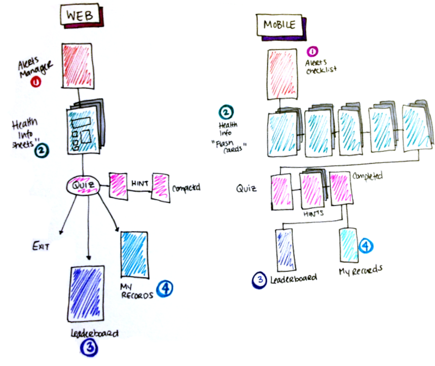 Translating main user flow from web to mobile. The main difference is that each "module" of the health info sheet is now its own "flash card" mobile screen. The user swipes through the flash cards to get to the quiz challenge. The mobile screens for the Alerts Manager, Leaderboard, and My Records maintain a similar structure as the web pages.