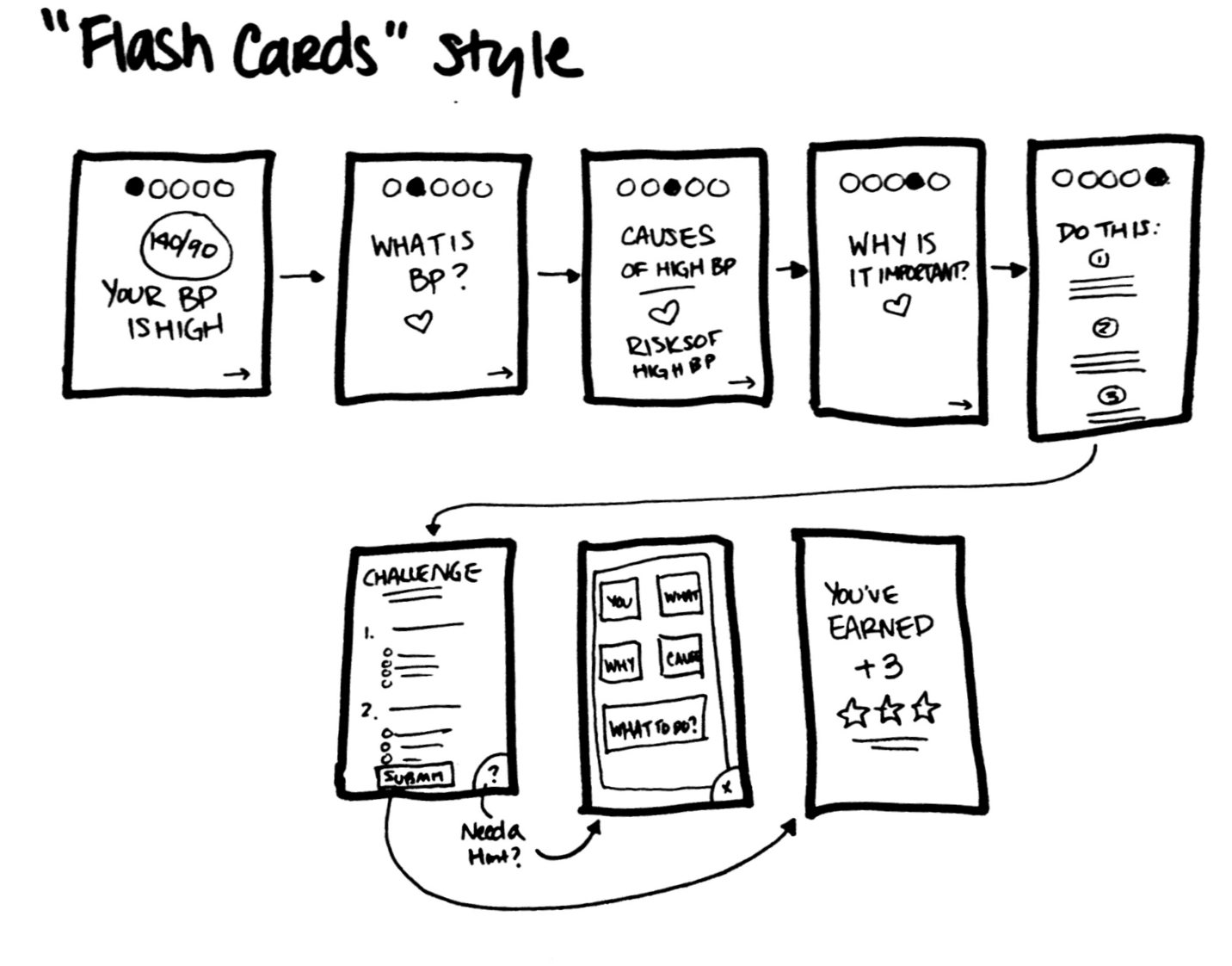 The mobile app user flow would remain the same as the web portal. The main differences would be in the presentation of health information and in the quiz functionality. We turned our "Health Fact Sheets" into "Health Flash Cards," each featuring a key piece of information.