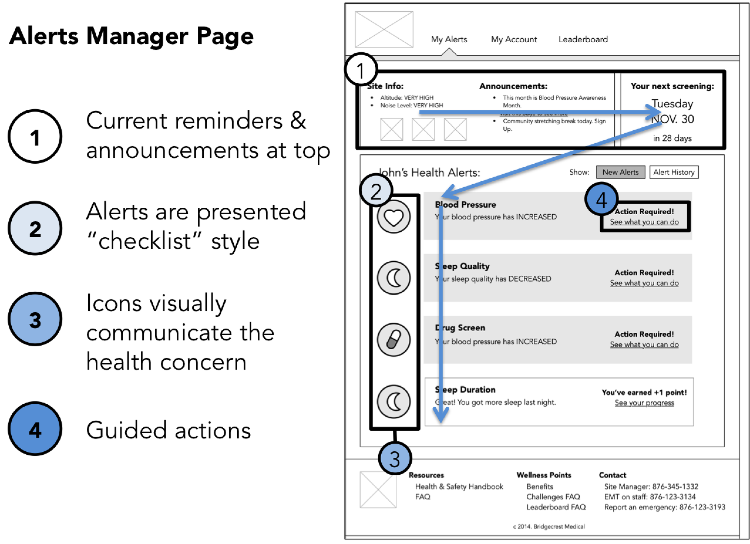 We also designed the visual layout of information to have a clear flow on each page. We wanted to use a repeatable visual pattern of information for each health metrics page so that the users can become familiar with the type of information found on certain locations of the page.